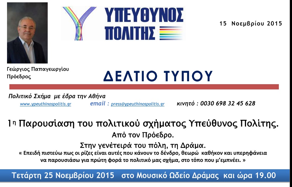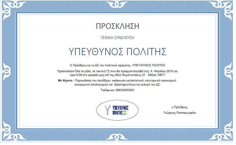 | ΠΡΟΣΚΛΗΣΗ Ο Πρόεδρος και το ΔΣ του πολιτικού σχήματος ΥΠΕΎΘΥΝ... διαβάστε περισσότερα | ||